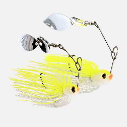 The Pro-Edition of our popular Monstervibe spinnerbaits in a new fish head design made of high-quality (leadfree) tungsten with a unique blade design. Super-versatile, fish the Mvibe Pro anywhere, from the shallows to super-deep water. Fitted with the new ‘Sure-Ring’ eyelet concept. Tie fishing lines directly to the open eyelet or add the ‘Sure-Ring’ when using snaps and wire leaders for pike. This wire shape assures perfect blade rotation and a straight, tangle-free presentation. Finally, the extra-fine pulsating skirts in super-realistic colour combinations and the highly polished blades make each of the Monstervibe Pro’s irresistible!