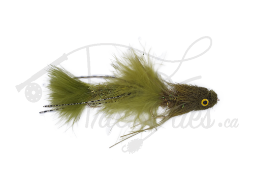 Galloup's Sex Dungeon Olive is our first articulated streamer and is a very popular fly for steelhead, bull trout, large and smallmouth bass, walleye and pike. Cast it to promising water and retrieve very quickly to entice a strike, then hold on. The current Trickflies.ca record holder for Walleye.