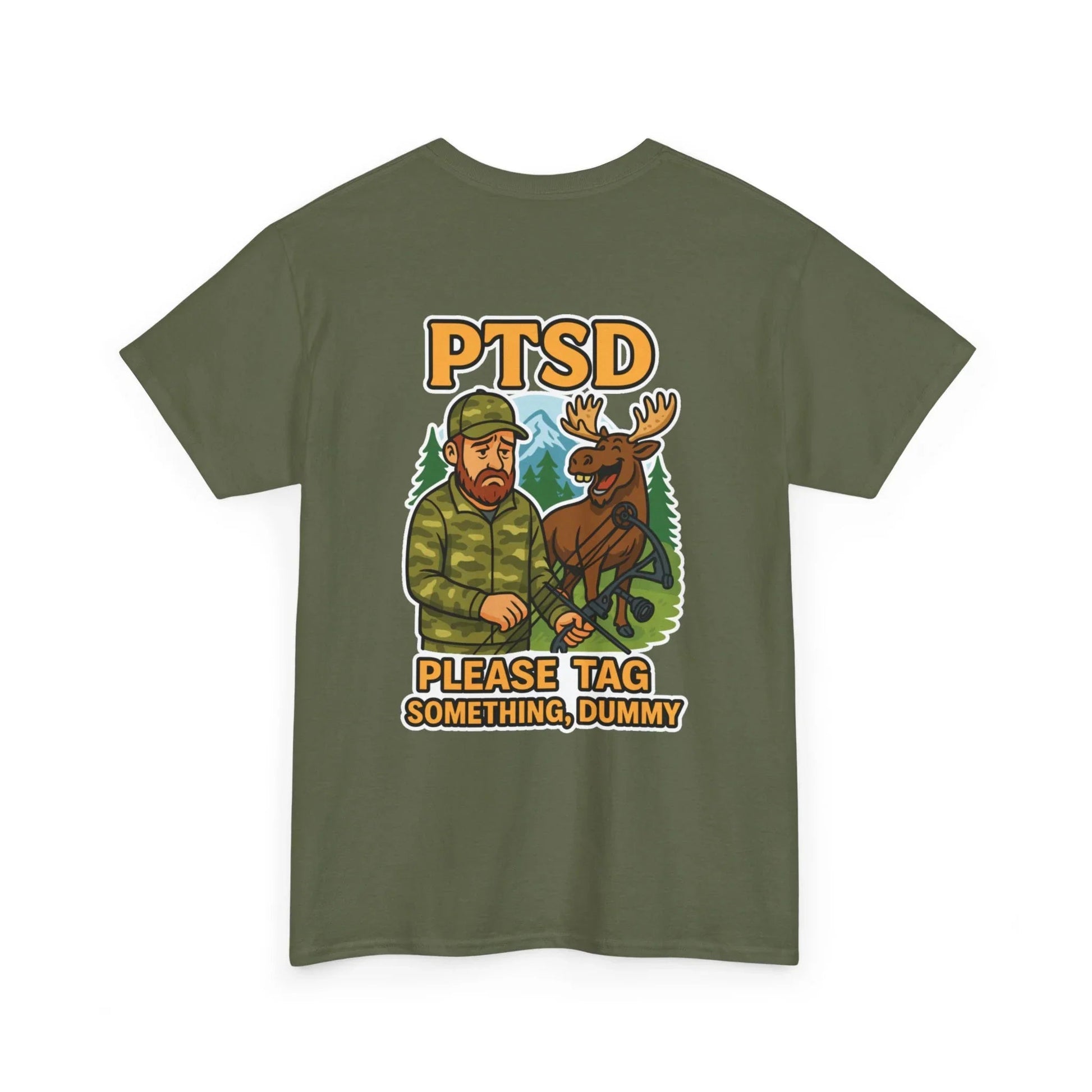 Take your next hunting trip further with our Funny shirt. This lightweight tee is perfect for outdoor lovers who enjoy a little humor by the fire. Each shirt’s clever slogan, "PTSD Please Tag Something, Dummy," adds an entertaining twist to your adventures. Wear it to the campsite or while exploring new trails. Get ready to spark smiles and start unique conversations.
