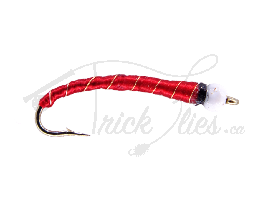 Our Ice Cream Cone White Head Red Body is best used as a chironomid pattern. When paired with our Ice Cream Cone White Head Black Body match the size and color to the hatch for non-stop action.