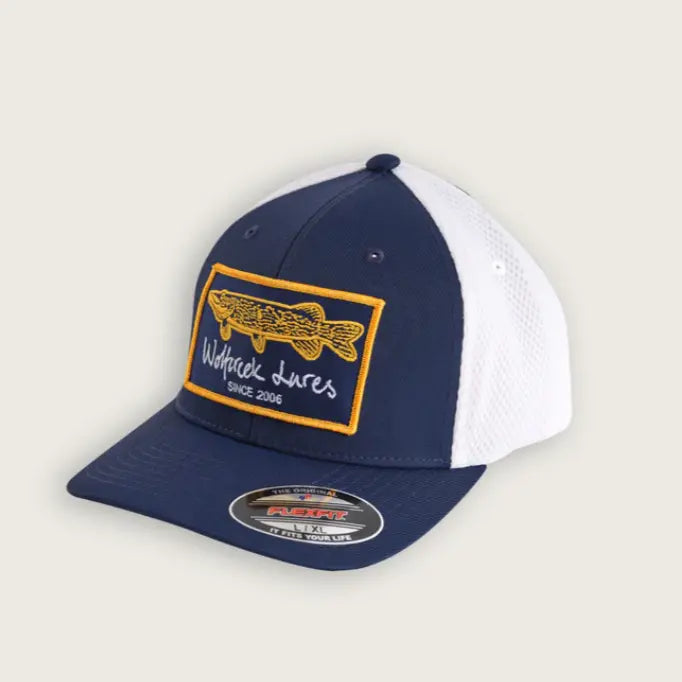 Classic Yupoong Airmesh 2-tone Flexfit in Navy/White with embroidered Pike Logo Patch.